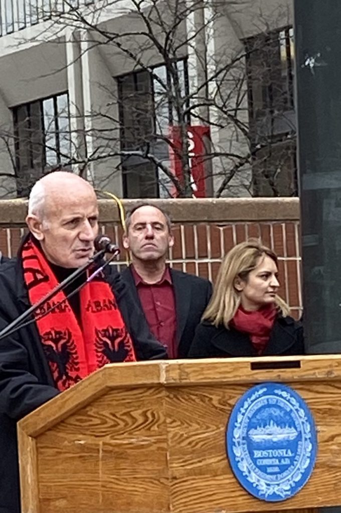 Takimin e hapi i riu Deni Hoxha, student në Universitetin e Harvardit. Duke folur për ditën e Flamurit, ai theksoi se kur u nisa për studime në Amerikë, ndër të tjera mora me vete një flamur të madh shqiptar, te cilin e kam vendosur në dhomë. Sa herë e hedh sytë te ai, më duket sikur më thotë:” Mos e harro Shqipërinë!” E mer pastaj fjalën kryetari i Shoqatës “Mass. Besa” , Mark Kosmo, i cili lexoi përshëndetjen e kryetarit të bashkisë së Bostonit, zotit Marty Walsh, ku ndër të tjera theksohej se komuniteti shqiptaro-amerikan, ka një kontribut të madh në diversitetin e historisë dhe kulturës së qytetit të Bostonit. Është një komunitet vital dhe dallohet përmes përpjekjeve të organizatave të ndryshme, bizneseve, etj. Mark Kosmo njoftoi se Shoqata “Mass.Besa” do dhurojë 5000 dollarë për familjet e dëmtuara nga tërmeti i rëndë.