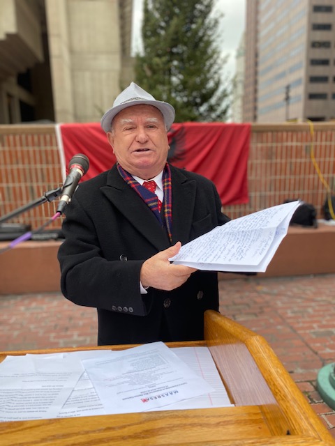 Ja disa fragmente të saj: …”Ditë zie ka sot Shqipëria/ në zi jemi edhe ne/ loti na ngriu nga dhimbja/ nuk ariti dot përdhe/hijerëndë sot flamuri/ gjysmë shtize po qëndron/nuk i qesh atij sot nuri/ mu në zemër i sëmbon/pranë na u gjendën/ vëllezrit kosovarë/ në Kosovë dyert hapën/ siç i hapëm ne më parë”, etj. Në emër të Shoqatës “Mass.Besa” dhe të Fondacionit Global Shqiptar, i cili është krijuar kohët e fundit, përshëndeti Ada Kokoshi, e cila theksoi kontributin e “Mass. Besës “ për shkollat shqipe e plot veprimatari të tjera, si dhe synimin e Fondacionit për të mbledhur kontribute për Shqipërinë. Recitimet e bukura të fëmijëve të shkollës shipe, e zbukuruan atmosferën dhe morën duartrokitjet e pjesëmarrësve. Si çdo vit, edhe sivjet pjesë e veprimtarisë ishte edhe Shoqata “Kosova” e Bostonit. Krahas urimit, kryetari i saj, Nexhat Ibishi, theksoi se Shoqata e tyre ka dhuruar 1000 dollarë në ndihmë të familjeve të prekura nga tërmeti. Një folës tjetër nga Ulqini, i ardhur në Amerikë për vizitë, zgjodhi Bostonin për të festuar ditën e Pavarësisë. Quhej Ilir Çapuni dhe ishte kryetar i kuvendit komunar të Ulqinit. Familja e tij qe me origjinë nga Çamëria por ishte shpërngulur që andej në vitin 1844. Ndër të tjera ai theksoi:”Shumë herë gjatë historisë së tij, populli shqiptar është rrëzuar dhe përsëri është ngritur në këmbë. Kështu do ngrihet edhe nga pasojat e tërmetit të fundit”. Një përshëndetje e veçantë ishte sivjet nga Shoqata “Çamëria”, mbajtur nga veprimtarja e saj, Vera Gjata. Ndër të tjera ajo theksoi se Greqia interesohet për komunitetin grek në Shqipëri, por nuk e ka të njëjtin interesim edhe për komunitetin shqiptar në Greqi. Ajo nuk i lejon shkollat shqipe, nuk lejon flamurin shqiptar, nuk lejon çamët të shkojnë në trojet e tyre. Ata nuk heqin dorë nga Vorio Epiri dhe ndërhyjnë në zonën e Himarës e zona të tjera, duke vendosur emra në greqisht, kur ato vende kanë patur ndër shekuj emra shqip. I moshuari Sami Hajdini, ashtu si vite të tjerë përshëndeti plot pasion, ku ndër të tjera lexoi edhe një poezi të tij për flamurin:” Folë moj shqiponjë folë/aty ngjitur në flamur/gjithë botës i trego/ se ti shqipe s’shuhesh kur’/folë shqipe mos ki frikë/ se ke mik një Amerikë” etj…Me tingujt e falamurit amerikan dhe atij shqiptar, u mbyll kjo veprimtari përkujtimore e shqiptarëve të Bostonit, ku spikati dhimbja e solidariteti me Shqipërinë tonë, të plagosur nga tërmeti i datës 26 nëntor, por që me solidraitetin e shqiparëve në atdhe, në trojet arbërore, në emigracion si dhe të miqve tanë nëpër botë, do t’i mbyllë plagët e shkatërimeve të tërmetit. Vetëm plaga e jetëve që ikën, nuk do të mbyllet.