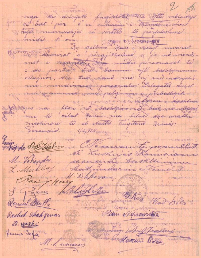 -“Së pari u bisedue protestimi q’i drejtohej Konferencës së Paqit dhe,mas një kundërshtim mendimesh u pranue si u hoqë frazi “Kur ka me kjenë nevojë,organizatorët kemi me i zgjedhë vetë”.Mas këti u bisedue shkresa,q’u drejtu Senatit t’Amerikës,e cila u pranue duke iu shtu tekstit fjalët “Kufit ethnografikë”,Të e mbramja këndohet shkresa për Parlamentin Italjanë, por , mbi tekstin e kësaj shkrese passi u banë shumë kundërshtime, u vendosë që kjo të rrëzohet e të formohet një Komision i ri për me ba një tjetër me mënyrë ma të rreptë”. (9)
