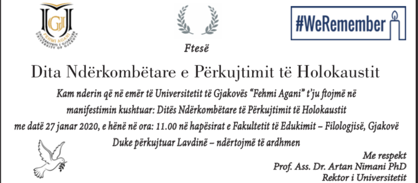 Në Universitetin e Gjakovës “Fehmi Agani” manifestimi kushtuar Ditës Ndërkombëtare të Përkujtimit të Holokaustit mbahet në mesditën e sotme në hapësirat e Fakultetit të Edukimit-Filologjisë./b.j/