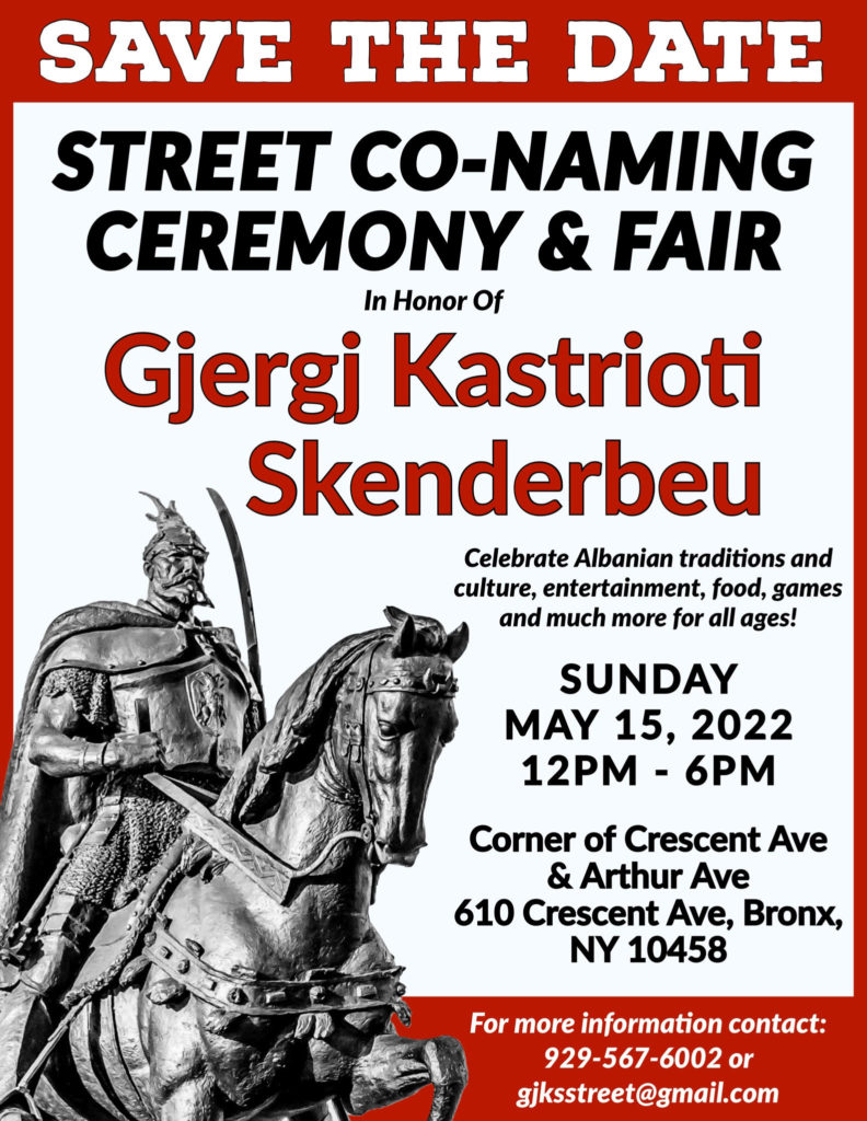Intersection of Arthur Avenue and Crescent Avenue (610 Crescent Ave Bronx, NY 10458). We encourage you to add your organization’s name to the final flyer that will be sent back to you to be shared. Please let us know if you would like to have your organization’s name on the final flyer ASAP. Email markgjonaj1@gmail.com with your organization name.The event will include street naming, Gjergj Kastrioti Skenderbeu and street fair with the best of the best of Albanian traditions and culture for all to enjoy. Including entertainment, music, food, games and much more! something for all ages.Please find the save the date flyer for you to share and circulate amongst your members. Please post flyer on Facebook and all social media platforms. If you have any questions, please don’t hesitate to contact me directly at (917) 731 6850. I look forward to hearing from you.