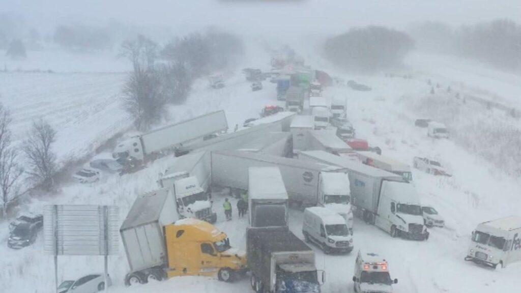 Policia e Shtetit të Michiganit konfirmoi se 30–40 kamionë të mëdhenj ishin të përfshirë në aksident, disa prej të cilëve u kthyen anash si lodra nga era e fortë. Dhjetëra persona u lënduan, por për mrekulli nuk pati viktima. Autostrada u mbyll plotësisht, ndërsa autobusë emergjence u dërguan për të shpëtuar shoferët e bllokuar mes stuhisë së borës.