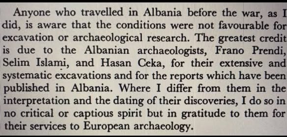 “Çdokush që ka udhëtuar në Shqipëri përpara Luftës së Dytë Botërore, siç bëra unë, është i vetëdijshëm se kushtet nuk ishin të favorshme për gërmime apo kërkime arkeologjike. Merita e madhe u duhet dhënë arkeologëve shqiptar Frano Prendi, Selim Islami dhe Hasan Ceka, për gërmimet e tyre ekstensive dhe sistematike, si dhe për raportet e publikuara në Shqipëri. Edhe pse kam kontradikta me ta për interpretimin dhe datimin e zbulimeve të tyre, e bëj këtë jo në shpirt kritik apo keqdashës, por në mirënjohje ndaj tyre, për shërbimin e tyre ndaj arkeologjisë Europiane.”