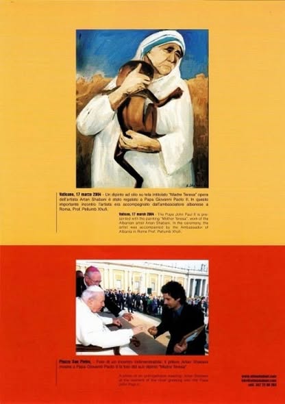 Ishte 17 marsi i vitit 2004 kur piktori Artan Shabani, me një emocion të papërshkrueshëm, do të takonte Papa Gjon Palin e Dytë dhe do dialogonte me Shenjtërinë e tij, teksa i dhuronte pikturën që kish realizuar për Nënë Terezën. Më kujtohet mirë kjo ngjarje, që pati jehonë në shtypin italian dhe në atë shqiptar. Lajmi u botua edhe në gazetën ku unë punoja. Dje u takova rastësisht me Artanin, pas shumë e shumë vitesh. Ai buzëqeshi me qetësi dhe m’u duk si një pelegrin në orët pa fund të meditimit; spontan dhe i pavarur, por me vështrimin nga fantazmagoria e kësaj bote. Folëm për ekspozitën e Luan Ramës me piktorët francezë të shekullit XIX, për folkloristin e famshëm Fatos Mero Rrapaj, që ende nuk ka një shtatore në Vlorë, për gjeneral Enriko Telinin, të cilit komunistët ia hoqën bustin afër parlamentit, realizuar nga skulptori Odhise Paskali, dhe e shkrinë në fonderi. Çuditërisht, atë bust, asnjë nga pushtetarët e pas viteve ’90-të, nuk u kujtua ta rivendoste atje ku ishte, tha Artani. Pastaj gjithë biseda jonë u zhvillua në heshtje….dhe unë po përpiqem ta zbardh në këto pak rreshta.