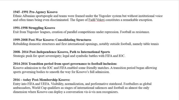 Adding that “Football, as a rule, is framed as a late byproduct of statehood. Kosovo is an exception. Sports in Kosovo functioned as a laboratory of agency long before political sovereignty was secured. Starting with parallel football leagues in the 1990s to strategic engagement with international federations, Kosova acted as a political subject even when it was denied formal recognition.”