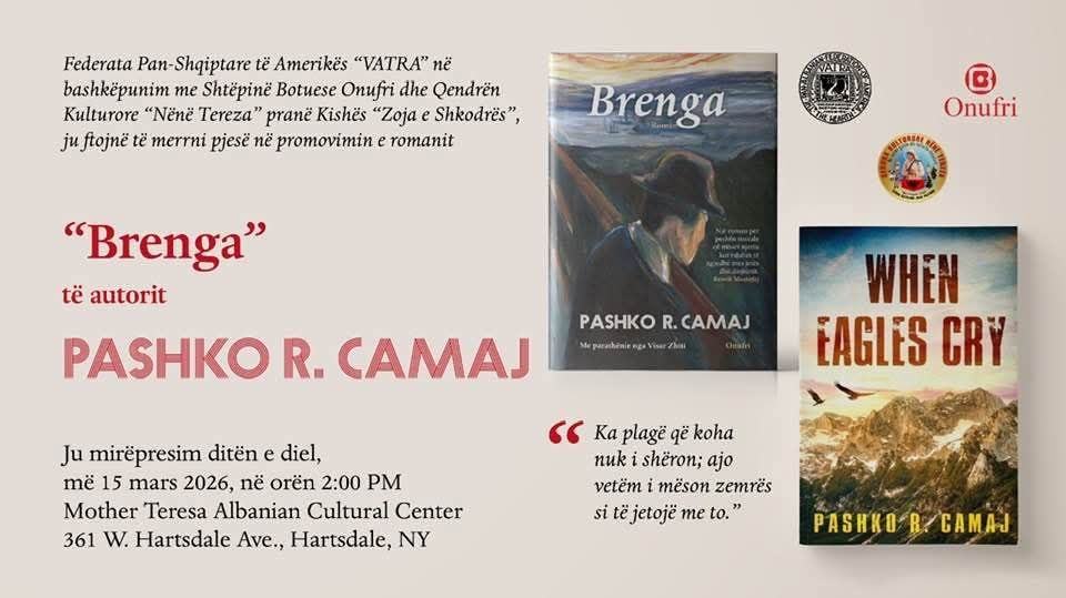 Federata Pan-Shqiptare të Amerikës “VATRA” në bashkëpunim me Shtëpinë Botuese Onufri dhe Qendrën Kulturore “Nënë Tereza” pranë Kishës “Zoja e Shkodrës”, ju ftojnë të merrni pjesë në promovimin e romanit: “Brenga” të autorit Dr. Pashko R. Camaj. “Ka plagë që koha nuk i shëron; ajo vetëm i mëson zemrës si të jetojë me to.”