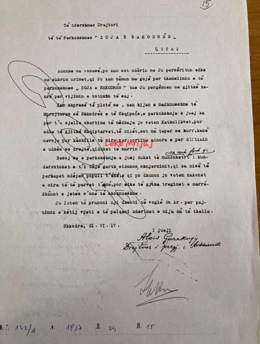 Simjet, në fund të vitit të dhittë të ngritjes së Flamurit, populli shqiptar me ndihmën e vet bujare, shef të përhidhet Flamuri, ene për er’, naltë mbi areopllane qi çajnë qillin, si me dash me i çu të fala dhe shpresa vllazënve të ronbuem… Shefqet Daji”