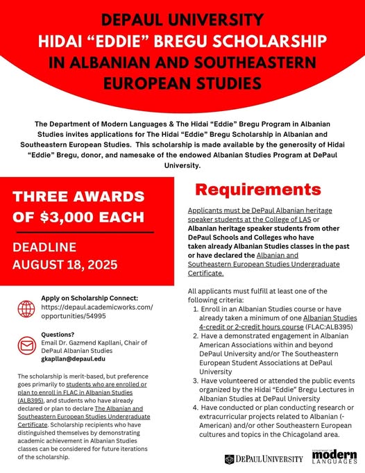 The Department of Modern Languages & The Hidai “Eddie” Bregu Program in Albanian Studies invites applications for The Hidai “Eddie” Bregu Scholarship in Albanian and Southeastern European Studies. This scholarship is made available by the generosity of Hidai “Eddie” Bregu, donor, and namesake of the endowed Albanian Studies Program at DePaul University.