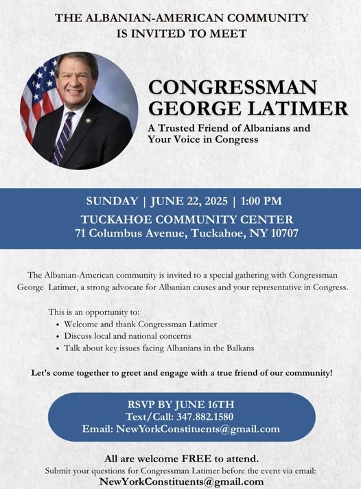 Dear Albanian American Community, we invite you to a special Meet & Greet with Congressman George Latimer on Sunday, June 22, 2025, from 1:00 PM to 2:00 PM at the Tuckahoe Community Center (71 Columbus Avenue, Tuckahoe, NY 10707). Doors open at 12:30PM. Event starts promptly at 1:00 PM.