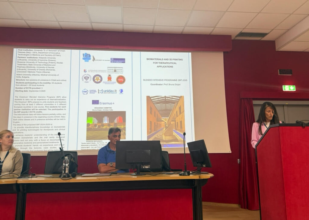 Në datat 08 -13 shtator 2025, në Universitetin “Gabriele d’Annunzio” Chieti Pescara, u zhvillua një program trajnimi mjaft interesant, “Biomaterials and 3D Printing for Therapeutical Applications”. Ky program u ideua dhe u organizua në mënyrë perfekte nga Prof. Bruna Sinjari, koordinatore dhe përgjegjëse e këtij aktiviteti. Aktualisht Prof. Bruna Sinjari është e deleguara e Rektorit e këtij universiteti për marrëdhëniet me universitetet e Ballkanit. Prej vitesh ajo ka dhënë një kontribut të spikatur në bashkëpunimin aktiv, të suksesshëm dhe të gjithanshëm ndërmjet Universitetit “Gabriele d’Annunzio” Chieti-Pesacara dhe Fakultetit të Mjekësisë Dentare.
