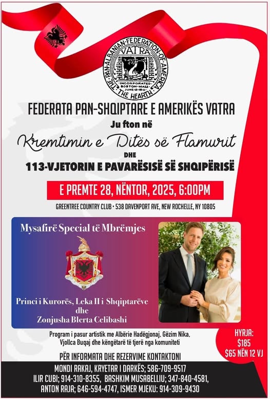 Mbrëmja e së premtes në veri të Bostonit u mbush me emocione, muzikë e aromë të traditës shqiptare. Federata Panshqiptare e Amerikës VATRA, së bashku me Albanian Boston Community Center, mblodhën dhjetëra familje shqiptare në një festë të ngrohtë për 113-vjetorin e Pavarësisë. Në një atmosferë plot gëzim, valle dhe ushqime shqiptare, kryetari i VATRËS në Boston, Mentor Maksutaj, përcolli urimet e tij për Ditën e Flamurit.