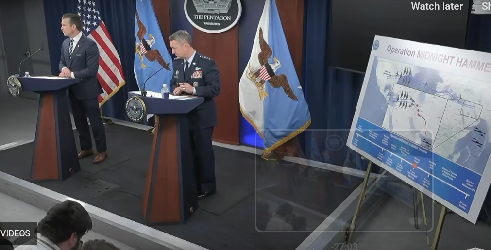 Sekretari i Mbrojtjes Pete Hegseth mbajti një konferencë për shtyp në orën 8 të mëngjesit sipas Orës Lindore të dielën në lidhje me bombardimin e objekteve bërthamore të Iranit. Hegseth u shoqërua nga Gjenerali i Forcave Ajrore Dan Caine, kryetari i Shtabit të Përbashkët.