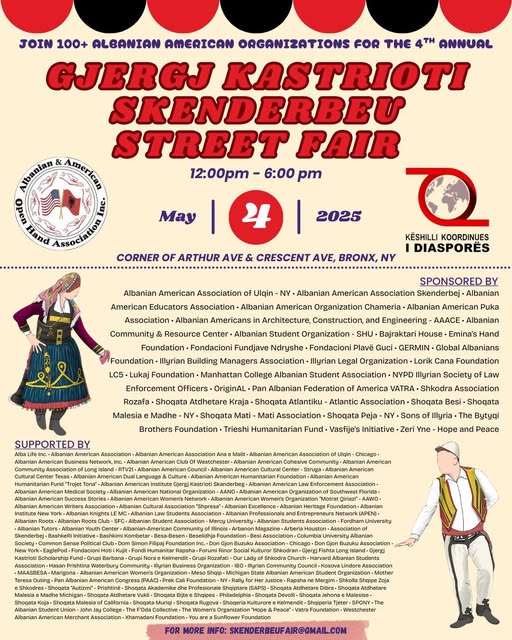 Join us for the 4th Annual Gjergj Kastrioti Skenderbeu Street Fair on Sunday, May 4th 12pm -6pm corner of Arthur Ave & Crescent Ave, Bronx
