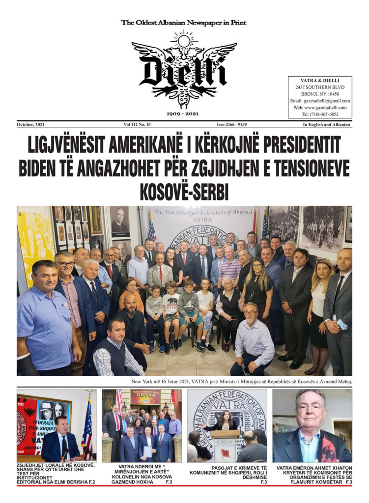Gazeta “Dielli” si Organi Zyrtar i Federatës Panshqiptare të Amerikës VATRA mori rrugën për në çdo cep e në çdo skaj të mërgatës shqiptare që jeton e vepron në Amerikë dhe Kanada. U shpreh vlerësim të posaçëm, falenderim të përzëmërt dhe mirënjohje të veçantë të gjithë bashkëpunëtorëve të këtij numri. Gazeta po rritet çdo ditë falë mbështetjes e vëmëndjes suaj.Jam i privilegjuar që bashkëpunojnë me “Diellin” mendjet më të mprehta, penat më të shkëlqyera dhe më të arrira të botës shqiptare që nga “Zëri i Amerikës”, mediat potente në Tiranë e Prishtinë, Akademikë, kërkues shkencorë në Fakultete dhe Njësi Kërkimi, analistë e kritikë letrarë, përkthyes, poetë, historianë, diplomatë, personalitete absolute të shkencës, ekspertë të ekonomisë, turizmit, arkivistikës, dhe kibernetikës, veprimtarë, humanistë e patriotë që na mbushin zemrën me gëzim e shpirtin me hare prej sukseseve e veprave të mira. Sukseset dhe arritjet e bijëve e bijave tona në mergatë pasqyrohen imtësisht në këtë numër. Shqiptarët në mergatën e Amerikës dhe Kanadasë e jo vetëm përbëjnë një krenari kombëtare.Gazeta “Dielli” ka në fokus komunitetin shqiptar në Amerikë, Kanada e kudo ku jetojnë e punojnë shqiptarë që me suksesin e tyre lartësojnë e krenojnë kombin tonë. Gazeta “Dielli” ka në themel historinë, kulturën, gjuhësinë, albanologjinë, arkeologjinë, median, shkencat politike, marrëdhëniet ndërkombëtare, data, ngjarje dhe figura të shquara të kombit shqiptar. Qëllimi i gazetës është informimi i saktë, promovimi i talenteve dhe personaliteteve të botës shqiptare në mërgatë, promovimi i suksesit dhe thithja e mendimit intelektual në gazetën Dielli, ruajtja e gjuhës, kulturës, traditës dhe identitetit kombëtar shqiptar në mërgatën e Amerikës dhe Kanadasë, gjithashtu të jetë si një urë lidhëse mes shqiptarëve të mërguar dhe Atdheut mëmë Shqipërisë, Kosovës dhe viseve shqipfolëse.Faleminderit dhe mirënjohje për të gjithë ju që mbështesni gazetën më të vjetër të botës shqiptare, gazetën “Dielli” që nga 15 Shkurti i vitit 1909.Faleminderit që na besoni.Faleminderit që na ndiqni.Faleminderit që na mbështesni.Faleminderit që bashkoheni me ne.