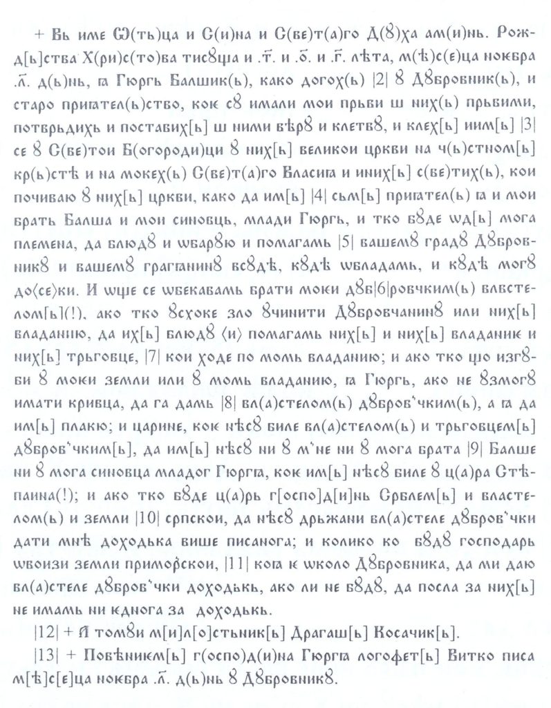 Kur erdha në Dubrovnik [gjeta mikpritjen, m.a.] dhe miqësinë e vjetër që kishin të parët e mi me të tyret, konfirmoj dhe vendos me ta besimin e betimin dhe iu gjunjëzohem atyre para Shën Mërisë, në Kishën e tyre të madhe, në Kryqin e Shenjtë dhe në reliktet e Shën Vllahut dhe gjërat e tjera të shenjta të cilat ndodhen në kishën e tyre, që unë jam mik i tyre së bashku më vëllain tim Balshën dhe nipin tim, Gjergjin e ri; dhe kushdo nga fisi im – do të ruajë, mbrojë e ndihmojë qytetin tuaj, Dubrovnikun dhe qytetarin tuaj gjithandej ku sundoj deri ku mund të arrij [pushteti im, m.a.]. Dhe prapë ju premtoj vëllezërve të mi fisnikë dubrovnikas që nëse dikush dëshiron t’i bëj keq Dubrovnikut ose pushtetit të tij, do të ruaj dhe do t’i ndihmoj ata [dubrovnikasit] dhe pushtetin e tyre dhe tregtarët e tyre të cilët kalojnë nëpër sundimin tim. Dhe nëse dikush nga ata humbet diçka në territorin tim ose në sundimin tim, unë Gjergji, nëse nuk do mund të gjej fajtorin që t’ia dorëzoj fisnikërisë dubrovnikase, unë do ju paguaj dëmin. Dhe doganat të cilat nuk vlenin për fisnikërinë dhe tregtarët dubrovnikas në kohën e perandorit Stefan, nuk do të jenë as nën sundimin tim e as të vëllait tim Balshës, as të nipit tim, Gjergjit të ri. Dhe nëse dikush bëhet perandor i serbëve dhe i fisnikëve dhe tokës serbe, fisnikët dubrovnikas nuk janë të detyruar të më paguajnë taksa që shkruaj. Dhe derisa të jam zot i kësaj toke bregdetare që është përreth Dubrovnikut – të më paguajë taksa fisnikëria dubrovnikase, dhe nëse unë nuk munden që asnjë punë të bëj për ta, ata nuk duhet të më paguajnë taksa.
