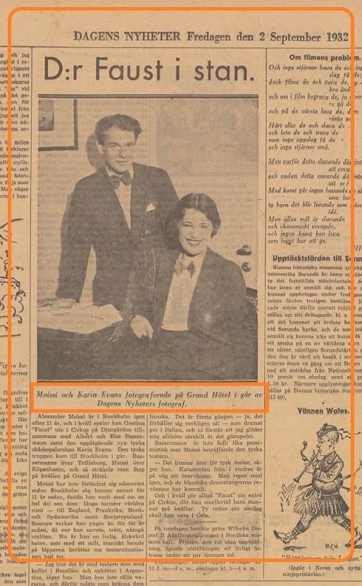 Ndërkaq, për vizitën e Aleksanër Moisiut në vitin 1932 e njëjta gazetë ka shkruar më 2 shtator 1932, ditë e premte, artikullin ”D:r Faust i stan”, shqip: ”Dr. Fausti në qytet”. Kësaj radhe Aleksandër Moisiu luajti së bashku me aktoren gjermane Karin Evans. Gazeta sjell edhe një foto të përbashkët të këtyre dy aktorëve, të shkrepur në Grand Hotel nga fotoreporteri i gazetës Dagens Nyheter.