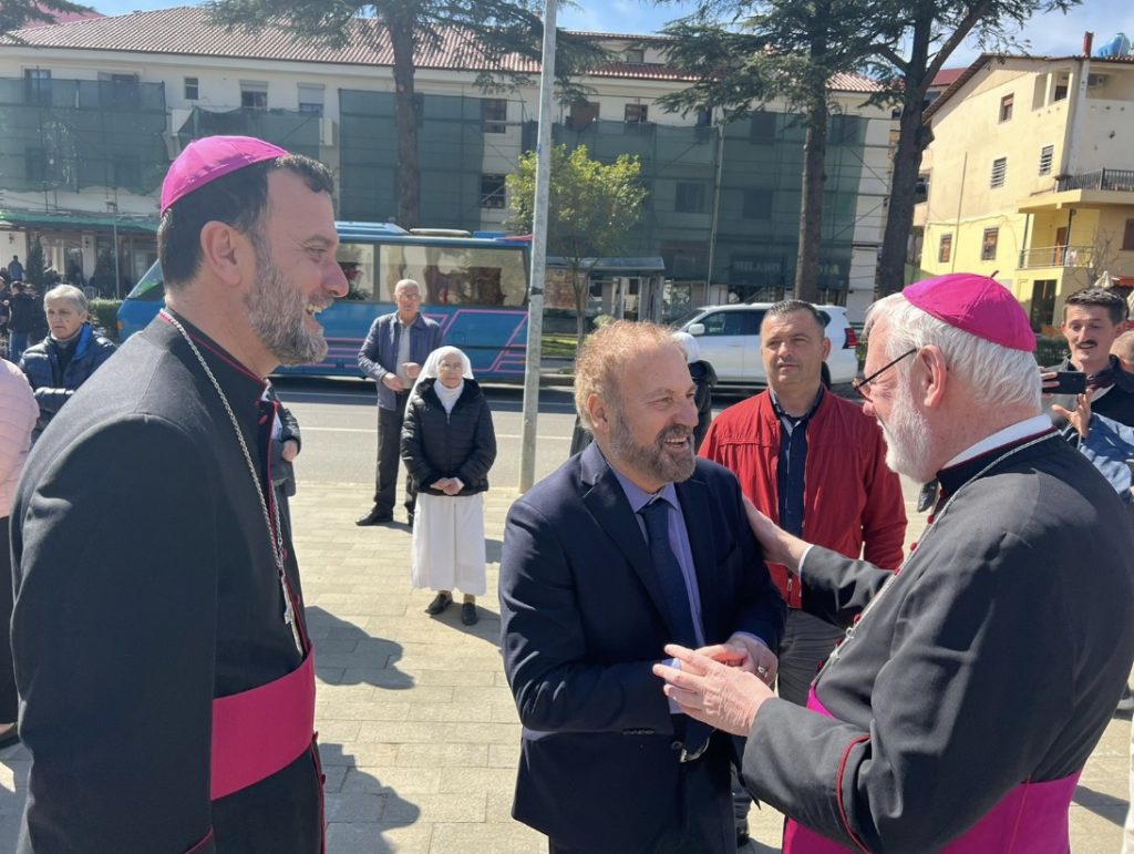 Ja, mbërritën veturat te sheshi, zbriti Shkëlqesia e tij, Imzot Paul Richard Gallagher, Sekretar i Shtetit të Vatikanit për Marrëdhëniet me Shtetet dhe Organizmat Ndërkombëtare ose Ministri i Jashtëm i Selisë së Shenjtë, po ngjiste shkallët e Katedrales. Ai do të kremtonte meshën e së dielës.