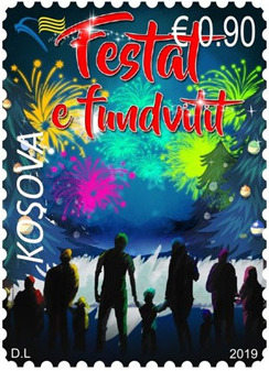 Ne emisionin e dyte te tematikes qe shqyrtojme, pulla e pare ne fig.3 është një nga më të realizuarat vizualisht në filatelinë kosovare moderne, duke kombinuar ngjyrat, simbolikën dhe emocionin për të shprehur atmosferën e festave të fundvitit. Ajo i përket emisionit të vitit 2019, një periudhë kur Posta e Kosovës intensifikoi përdorimin e motiveve grafike moderne dhe festive për publikun e gjerë. Në sfond shpërthejnë fishekzjarre të mëdha në ngjyra vjollcë, blu, jeshile e të verdhë. Te cilat krijojnë një ndjesi dinamike dhe festime masive publike dhe sugjerojnë nisjen e një viti te ri me shpresë. Në pjesën e poshtme shfaqet një grup i madh njerëzish të vendosur përballë skenës së fishekzjarreve. Këto figura përfaqësojnë bashkësinë, familjet dhe brezat e ndryshëm, japin një ndjesi bashkimi, gëzimi kolektiv dhe shoqërizimi; pasqyrojnë traditën shqiptare te festimeve të përbashkëta të fundvitit në qytete, sheshe dhe ambiente publike në Kosovë. Prania e fëmijëve e bën imazhin veçanërisht emocional, duke treguar se festat nuk janë thjesht ngjarje, por përjetime të një brezi në tjetrin. Pulla e dyte paraqet një kompozicion ikonografik që ndërthur simbolikën kombëtare me atmosferen festive të fundvitit, duke e pozicionuar Kosovën në një dimension shpirtëror, kulturor dhe komunikues tipik të traditës festive evropiane. Elementi qendror i paraqitjes eshte globi ku shfaqet konturi i hartës së Kosovës i vendosur mbi sfondin me yjet e flamurit shtetëror, qe funksionon si metaforë vizuale e shtetësisë së qëndrueshme dhe aspiratave integruese të vendit. Rrethimi i imazhit me elemente të dekorit festiv, drita të arta, ornamente të Krishtlindjeve dhe degë halore, i shton pullës dimensione të gëzimit dhe te paqes, duke e vendosur këtë emision brenda traditës së pullave të fundvitit që promovojnë urimet ndërkombëtare. Ky emission “Festat e fundvitit” është një shembull i shkëlqyer i filatelisë tematike bashkëkohore, që refleton energjinë e festave, bashkimin e njerëzve dhe ngrohtësinë e fundvitit, duke e bërë një nga emisionet më tërheqëse të Postës së Kosovës.