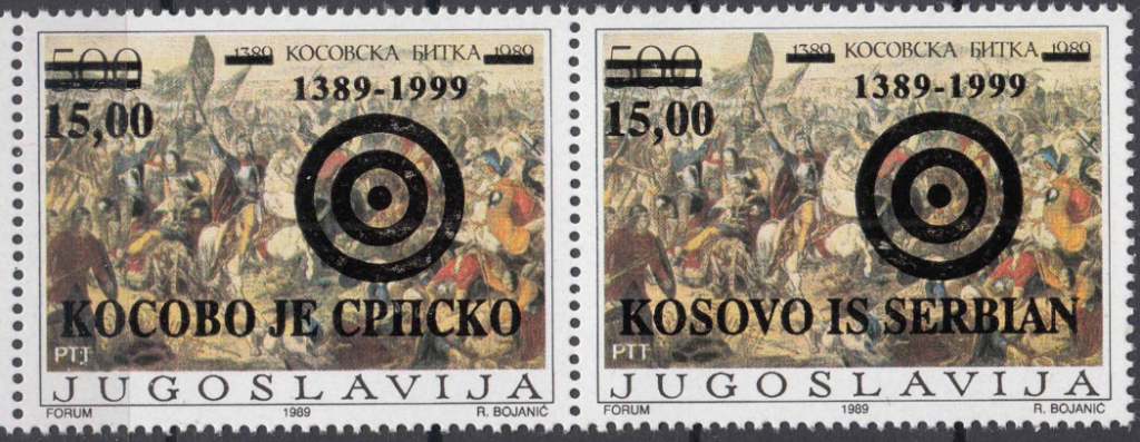 Fig.3 paraqet një variant me mbishtypje të pullës së vitit 1989, mbi të cilën është shtuar shprehja “Kosova është Serbi” dhe është ndryshuar vlera nominale nga 500 dinarë në 15,00. Ky objekt nuk është më produkt i drejtpërdrejtë i postës shtetërore, por rezultat i ndërhyrjeve private ose politike jashtë institucioneve zyrtare. Nga ana filatelike, fig.3 nuk ka status postar,sepse nuk ekziston dokumentacion zyrtar per kete mbishtypjeje. Për rrjedhojë, ai klasifikohet si variant jozyrtar, pa vlefshmëri postare, por me interes të lartë studimor, per te arritur ne perfundimin, qe pikërisht kjo mungesë zyrtarizimi tregon se filatelia mbetet e ekspozuar ndaj manipulimit ideologjik edhe pas daljes nga kontrolli shtetëror. Historikisht, ndryshimi i vlerës lidhet me hiperinflacionin ekstrem të Jugosllavisë në vitet 1990–1994, duke e kthyer pullën në dëshmi të kolapsit ekonomik dhe institucional të shtetit serb. Politikisht, slogani i drejtpërdrejtë “Kosova është Serbi” përfaqëson një radikalizim të plotë të diskursit nacionalist serb. Ndryshe nga fig.1 dhe fig.2, ku pretendimi territorial maskohet përmes mitit historik dhe simbolikës fetare, këtu ai shfaqet hapur, si pohim përjashtues dhe racist. Ky kalim dëshmon se nacionalizmi serbomadh, në kushte krize politike dhe shoqërore, braktis gjuhën e tërthortë simbolike dhe kalon në deklarata të drejtpërdrejta, të zhveshura nga çdo përpjekje për legjitimim diplomatik. Analiza e fig.1, fig.2 dhe fig.3 tregon se filatelia nuk është një fushë neutrale, por një hapësirë ku historia, politika dhe pushteti ndërthuren. Nga përkujtimi ceremonial i vitit 1939, te mobilizimi nacionalist i vitit 1989 dhe deri te ndërhyrjet propagandistike te nacionalizmit ekstrem të viteve ’90, këto objekte filatelike, dëshmojnë vijimësinë e një ideologjie pushtuese dhe asimiluese ndaj Kosovës. Në këtë kuptim si dokumente te prekshme te nacionalizmit dhe racizmit serbomadh dhe politikave te tij per dominim kulturor i lejon studiuesit të zbërthejnë dhe të denoncojnë mekanizmat simbolikë të pushtimit dhe përjashtimit.