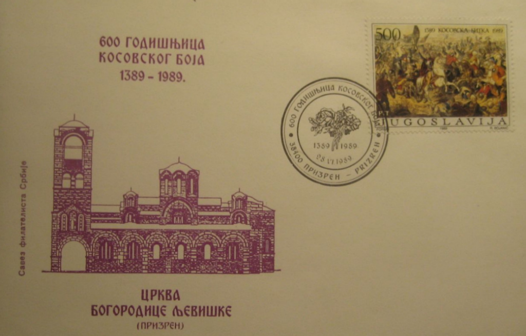 Zarfi i vitit 1989, i lëshuar me rastin e 600-vjetorit të së njëjtës betejë, shfaq një fazë të re dhe më agresive të përdorimit politik të filatelisë. Ndryshe nga viti 1939, ky përvjetor përkon me shpërbërjen e Jugosllavisë socialiste, rritjen e nacionalizmit serbomadh dhe krizën e thellë politike në Kosovë. Historikisht, beteja e Kosovës riaktivizohet jo më si kujtesë e largët, por si mit mobilizues, i lidhur drejtpërdrejt me ngjarjet e Gazimestanit dhe me politikat shtypëse ndaj shqiptarëve të Kosovës, ne te cilen e kaluara përdoret për të justifikuar veprime konkrete pushtuese në të tashmen. Politikisht fig.2 përfaqëson një shkallëzim të instrumentalizimit të histories, ne te cilen miti shërben për të forcuar pushtimin, për të nxitur ndjenja nacionaliste dhe për të legjitimuar një rend përjashtues, të mbështetur në racizëm dhe dominim etnik. Ikonografia e betejës, gjuha cirilike dhe përzgjedhja e Prizrenit si vend simbolik për vulën postare krijojnë hapësirë ku realiteti historik dhe shumetnik i Kosovës fshihet qëllimisht. Nga këndvështrimi filatelik, fig.2 është një zarf përkujtimor zyrtar (FDC), i pajisur me pullë prej 500 dinarësh, vulë speciale dhe ilustrime të monumenteve fetare, megjithatë, funksioni i tij kryesor nuk është qarkullimi postar, por shërbimi i drejtpërdrejtë i propagandës politike dhe i një interpretimi të shtrembëruar të historisë.Krahasimi me fig.1 tregon një vijimësi ideologjike të qartë, në vitin 1939 miti shërben për konsolidim identitar te rreme, ndërsa në vitin 1989 ai shndërrohet në instrument mobilizimi dhe përgatitjeje për konflikt.