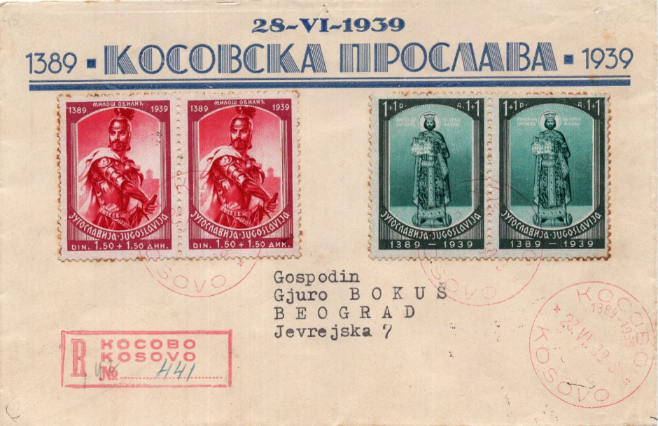 Zarfi perkujtimor dhe njeheresh i qarkulluar i vitit 1939 ne fig.1, i lëshuar me rastin e 550-vjetorit të Betejës së Kosovës, i përket fazës kulmore të filatelisë së Mbretërisë së Jugosllavisë. Përvjetori lidhet me Vidovdanin, një datë e shume vlersuar historike dhe fetare në kulturën politike serbe, ku beteja e vitit 1389 interpretohet jo si humbje ushtarake. Beteja e humbur kundër Perandorisë Osmane, e zhvilluar nga një koalicion ballkanik, përbën një rast pothuajse unik ne bote, ku humbja ushtarake është mitizuar dhe shndërruar në vlerë morale dhe shpirtërore, e kultivuar për shekuj në diskursin shtetëror serb. Historikisht, rikthimi te ky mit në prag të Luftës së Dytë Botërore synonte krijimin e një ndjenje vazhdimësie dhe stabiliteti simbolik në një Evropë të thellësisht të trazuar. Historia mesjetare u përdor për të justifikuar pushtimin dhe kontrollin shtetëror mbi Kosovën, duke e paraqitur atë si hapësirë “historikisht serbe”. Politikisht imazhi ne fig.1 është produkt i ideologjisë shtetërore të kohës, e cila kërkonte të konsolidonte unitetin e brendshëm përmes një historie të vetme, të dominuar nga elementi serb. Titulli “Kosovska proslava”, përdorimi ekskluziv i gjuhës cirilike dhe ikonografia heroike përjashtojnë çdo prani tjetër historike dhe kulturore, duke e zhveshur Kosovën nga realiteti i saj shumetnik. Nga ana filatelike, objekti është një emetim zyrtar me funksion të plotë postar dhe koleksionues, por ngarkesa nacionaliste dhe raciste e shndërron atë në dokument politik, ne te cilen vulat përkujtimore, shenjat e regjistrimit dhe ikonografia fetare e kthejnë zarfin si mjet i shtypjes nacionaliste përmes simboleve historike.
