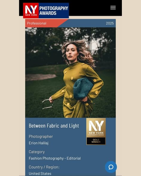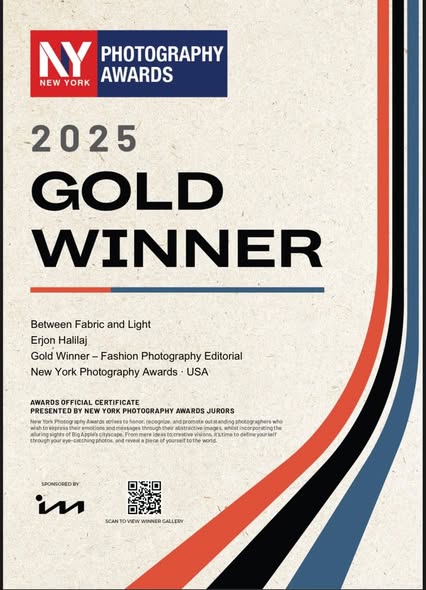 Konkursi ku u shpalla fitues është New York Photography Awards, një konkurs ndërkombëtar që vlerëson fotografë nga e gjithë bota. Për të njëjtën fashion editorial photo, unë fitova Gold Winner dhe gjithashtu Silver Winner në kategorinë Fashion Photography – Editorial. Këto çmime janë njohje ndërkombëtare për punën dhe vizionin tim artistik, dhe për mua përfaqësojnë motivim dhe afirmim të nivelit tim profesional.