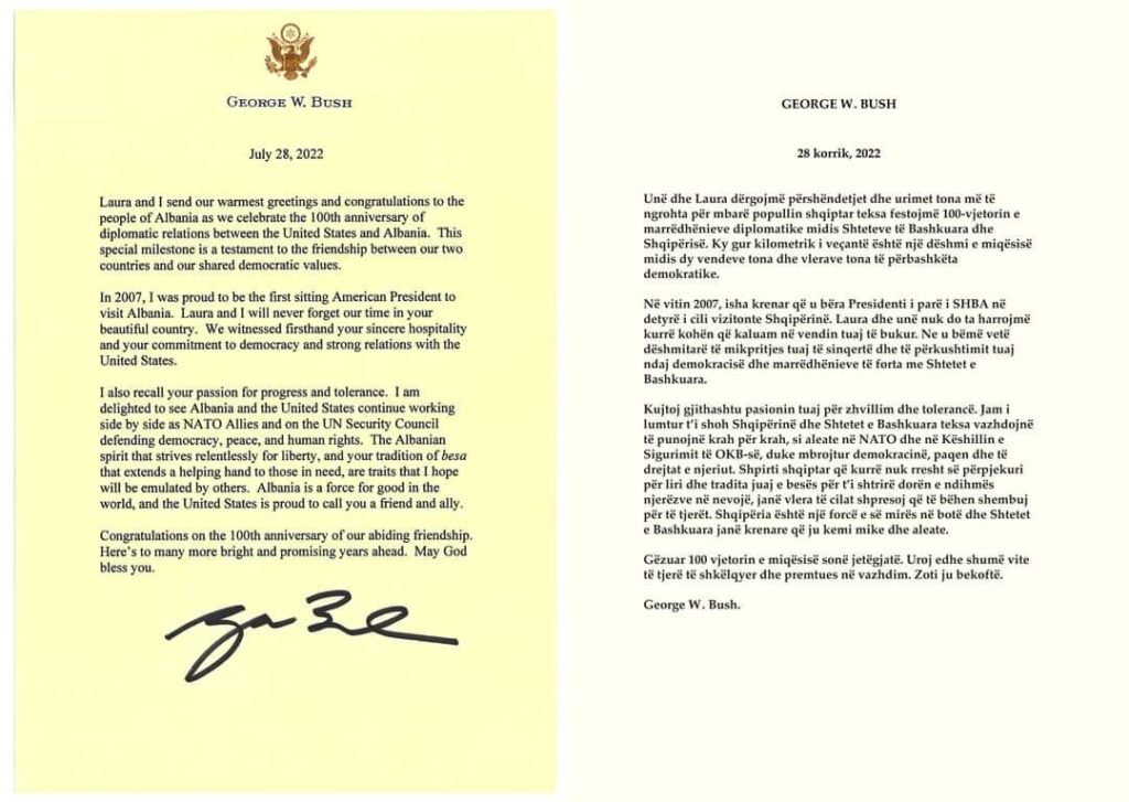 28 korrik, 2022 Unë dhe Laura dërgojmë përshëndetjet dhe urimet tona më të ngrohta për mbarë popullin shqiptar teksa festojmë 100 – vjetorin e marrëdhënieve diplomatike midis Shteteve të Bashkuara dhe Shqipërisë. Ky par kilometrik i veçantë është një dëshmi e miqësisë midis dy vendeve tona dhe vlerave tona të përbashkëta demokratike. Në vitin 2007, isha krenar që u bëra Presidenti i parë i SHBA në detyre i cili vizitonte Shqipërinë, Laura dhe unë nuk do ta harrojmë kurrë kohën që kaluam në vendin tuaj të bukur. Ne u bëmë vete dëshmitarë së mikpritjes tuaj të sinqertë dhe të përkushtimit tuaj ndaj demokracisë dhe marrëdhënieve të forta me Shtetet e Bashkuara. Kujtoj gjithashtu pasionin tuaj për zhvillim dhe tolerancë. Jam i lumtur t’i shoh Shqipërinë dhe Shtetet e Bashkuara teksa vazhdojnë të punojnë krah për krah, si aleate në NATO dhe në Këshillin e Sigurimit të OKB – së, duke mbrojtur demokracinë, paqen dhe të drejtat e njeriut. Shpirti shqiptar që kurrë nuk rresht së përpjekuri për liri dhe tradita juaj e besës për t’i shtrirë dorën e ndihmës njerëzve në nevojë, janë vlera të cilat shpresoj që të bëhen shembuj për të tjerët. Shqipëria është një forcë e së mirës në botë dhe Shtetet e Bashkuara janë krenare që ju kemi mike dhe aleate Gezuar 100 vjetorin e miqësisë sonë jetëgjatë. Uroj edhe shumë vite të tjerë të shkëlqyer dhe premtues në vazhdim. Zoti ju bekoftë. George W. Bush