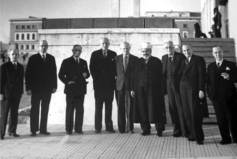 Në foto nga e djathta në të majtë janë disa nga delegatët e Kuvendit të Vlorës, në mes tyre Hafis Sherif Langu me çallmë në kokë; Eqrem Bej Vlora, Rexhep Mitrovica, Dervish bej Biçaku, Hafiz Sherif Langu, Lef Nosi, Rauf Fico, Ali Asllani, Ferid Vokopola dhe Dhimitër Berati.