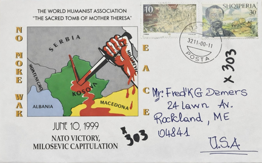 Zarfi i dytë, i vulosur në bazën ushtarake amerikane Ft. Myer, Arlington, Virginia më 13 tetor 1999, përkon me periudhën menjëherë pas përfundimit të ofensivave ajrore të NATO-s. Në pjesën e majtë, zarfi paraqet logon zyrtare të NATO-s në 50-vjetorin e themelimit (1949–1999), e shoqëruar me emrat e kombeve anëtare, duke e paraqitur Aleancën si një entitet të bashkuar. Veçanërisht domethënëse është pulla amerikane e 33 centëve për 50-vjetorin e NATO-s, e vendosur ngjitur me pullën gjermane “Kosovo-Hilfe 1999”. Ky kombinim imazhesh krijon atë që mund ta quajmë “filateli hibride”, një gjetje e rrallë që dokumenton bashkëveprimin transatlantik në ndërhyrjen për Kosovën, rolin e SHBA-së si forcë udhëheqëse e NATO-s dhe konfirmimin politik të moralitetit të ndërhyrjes ushtarake përmes simboleve të dy shteteve të ndryshme në një zarf të vetëm. Vula postare e bazës ushtarake amerikane tregon se kjo menyre ishte pjesë e komunikimit të strukturave ushtarake që ndodheshin në misione të lidhura me Kosovën. Ky zarf përfaqëson fazën e dytë, ate te konsolidimit e legjitimitetit ndërkombëtar, dhe mesazhin politik të solidaritetit euro-atlantik.