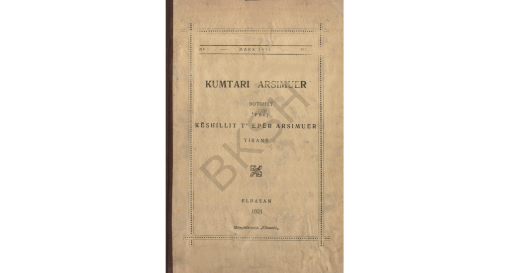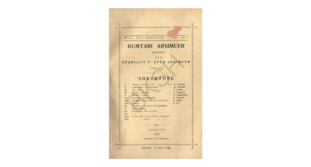 [5]Kumtari Arsimuer: Revistë Pedagogjike-arsimore, gjuhësore, letrare e kritike, no. 1 (Tiranë, 1920), II. (https://bibliotekadigjitale.bksh.al/iiif/?c=collections%21periodik&fbclid=IwAR3ARTbFfyE4gT6UhyU8rLWvcUBHIEw2KlVyas_dr343nkpL_LNrgUN5Oi4&view=ImageView&manifest=https%3A%2F%2Fbibliotekadigjitale.bksh.al%2Fiiif%2FManifester%2FIIIF%2Fperiodik%21HASHf054%21010daf18.dir&canvas=https%3A%2F%2Fbibliotekadigjitale.bksh.al%2Fiiif%2FManifester%2FIIIF%2Fperiodik%21HASHf054%21010daf18.dir%21page7%2Fcanvas%2Fp7 Aksesuar në tetor 2021)