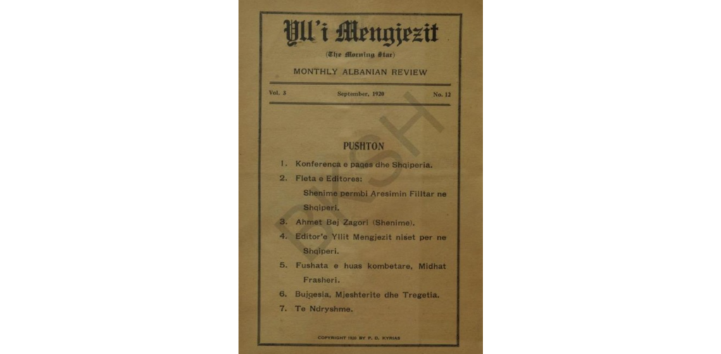[11] Parashqevi Qiriazi, ed. Yll’i Mengjezit = The Morning Star: revistë e përdyjavshme politike, shoqërore, historike, gjuhësore, letrare, pedagogjike, folkloristike etj., e ilustruar në gjuhët shqip dhe anglisht, vol. 3, no. 12 (Boston, Mass., september 1920), f. 328.