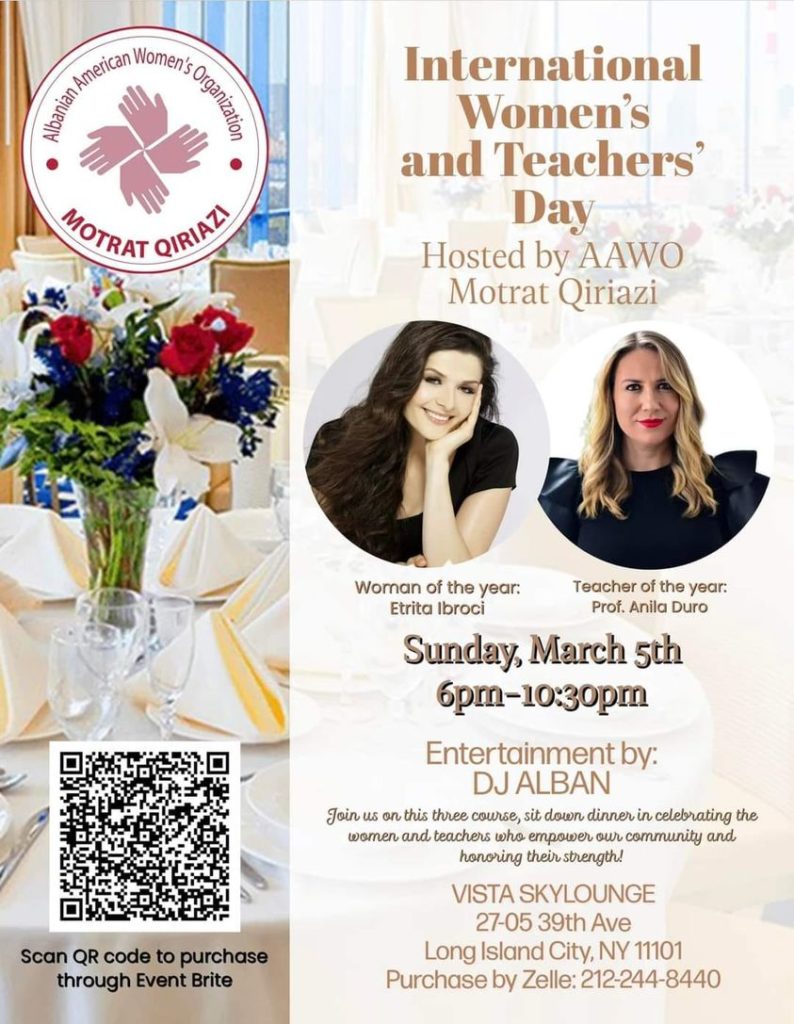 Please join us, on Sunday, March 5th, at Vista Skylounge in Long Island City, New York to celebrate Professor Anila Duro, Teacher of the Year, and Etrita Ibroci, Woman of the Year. Hosted by AAWO Motrat Qiriazi, the evening will feature music by DJ Alban and is the ideal opportunity to express gratitude to the women and teachers that have had a positive impact in our lives. From 6pm-10:30pm, we will honor their strength and empowerment. For $150, we invite you to be part of this remarkable gathering, to recognize the women and teachers that enrich our community and demonstrate our solidarity for International Women’s and Teachers’ Day.Please pay by Zelle at 212-244-8440 or via Eventbrite.