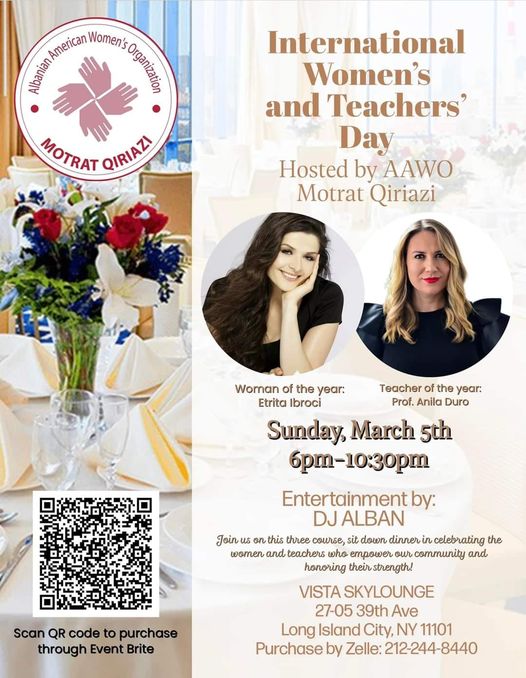 Please join us, on Sunday, March 5th, at Vista Skylounge in Long Island City, New York to celebrate Professor Anila Duro, Teacher of the Year, and Etrita Ibroci, Woman of the Year. Hosted by AAWO Motrat Qiriazi, the evening will feature music by DJ Alban and is the ideal opportunity to express gratitude to the women and teachers that have had a positive impact in our lives. From 6pm-10:30pm, we will honor their strength and empowerment. For $150, we invite you to be part of this remarkable gathering, to recognize the women and teachers that enrich our community and demonstrate our solidarity for International Women’s and Teachers’ Day.
