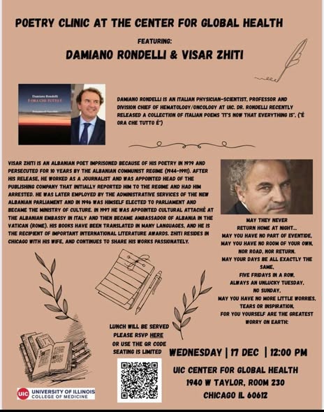 Ishte një takim ndryshe në Universitetin e Illinois-it, UIC, më i madhi i atij shteti. Në Departamentin e Mjekësisë, Qendra e Shëndetit Global, Kolegji i Mjekëve në fakultet ftonte poetin Visar Zhiti. Për se do të flitej, për poezinë, do të lexoheshin? Do të tregonte jetën e tij në diktaturë, burgun, traumën kolektive, lirinë më pas, mërgimin, do ta pyesnin për të gjitha këto?
