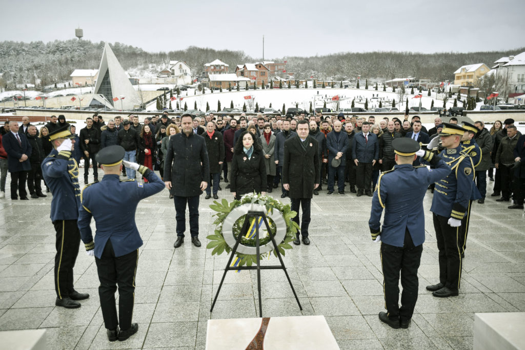 I shoqëruar nga Presidentja e Kosovës, Vjosa Osmani, Kryetari i Kuvendit, Glauk Konjufca e bashkëpunëtorë të tjerë, kryeministri Kurti tha se ishin sot në Prekaz, në 24-vjetorin e flijimit të tre brezave të familjes Jashari të cilët u sakrifikuan për lirinë e Kosovës, e bashkuan popullin dhe i dhanë hovin përfundimtar Ushtrisë Çlirimtare të Kosovës.
