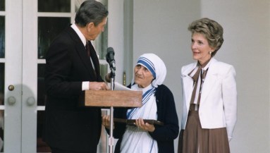 Në vitin 1985 kujtoj një dishka shumë interesante për një President të ShBA, që kam pa në TV. U tregue sesi atë ditë Presidenti Reagan dhe zonja e Tij Nensy kishin pritë në shtëpinë e tyne të pushimit Nanë Terezen. Ishte momenti kur Nanë Tereza po delte nga rezidenca e Tij… Erdhi një veturë tek dera e shtëpisë, që kishte dy tri kambë shkalla. Presidenti i dha dorën Nanë Terezës dhe zbriti ato dy kambë shkallë, hapi derën e mbapme të veturës dhe me dorë në dorezën e derës priti derisa zonja Nensy, po perfundonte përshndetjen me Nanë Terezen. Kur Nanë Tereza u nda dhe arriti tek dera e veturës, dera vazhdonte me kenë prap e mbajtun nga Presidenti Reagan, trupi i madh i të cilit ishte përkulë në shenjë nderimi ndaj Shqiptarës Nanë Tereza.., dhe me një buzqeshje të Tij sa dashamirëse aq edhe të sinqertë, i bani nderimin e fundit tue i mbyllë derën dhe tue qendrue gatitu derisa makina iku dhe nuk u pa ma…