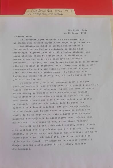 Të falemnderit për karturimin që më dërgove, gjë që shpreh edhe njëherë kujdesin dhe miqësinë që ke për mua. Megjithatë, më duket se ndodhja ime në darkën e Vatrës në Bronx në Nëntorin e kaluar, ka krijuar një përshtypje të gabuar, dhe si e tillë kërkon shpjegim.
