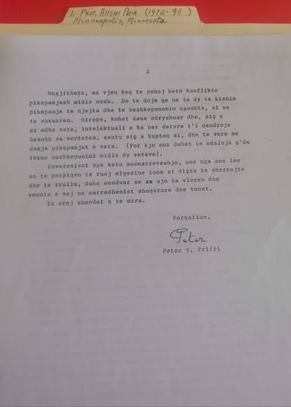 Kjo letër është pjesë e letërkëmbimit 25 vjeçar midis Peter Priftit dhe Profesorit Arshi Pipa, ruajtur në arkivin e familjes Prifti. Epistolari do jetë në botim së shpejti.