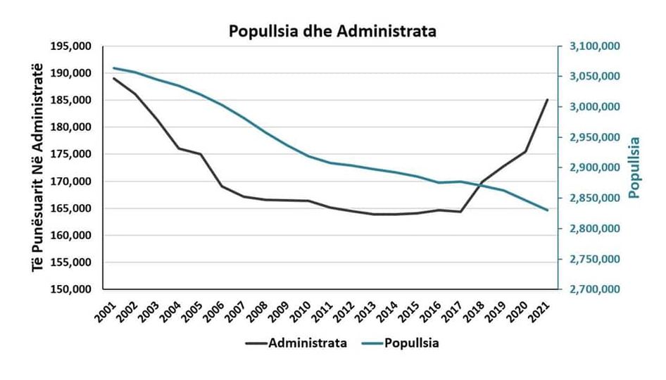 Ajo që shihet në grafikët më poshtë duhet të jetë alarmante për të gjithë ne. Administrata sot duhet të ishte me e vogël se asnjëherë më parë të paktën për dy arsye:1. Popullsia sot është më e ulëta e 30 viteve të fundit.2. Ne duhet të kishim përmërisuar efiçencën e administrates dhe si rrjedhojë për të njëjtat shërbime duhet të kishim më pak të punësuar.Mirpo ajo që ka ndodhur duke filluar nga 2017 është që administrata ka pësuar një rritje të shpejtë nga rreth 165,000 në 185,000 në vitin 2021. Edhe pse është e vështirë të vërtetohet dyshimet janë të forta që kjo është bërë për qëllime elektorale. Këtij dyshimi i shtohet edhe fakti që para zgjedhjeve të fundit administrata u rrit me rreth 12,000 vende pune në vetëm pak muaj. Disa u punësuan vetëm ditë para zgjedhjeve.Nëse punësimi në administrate është përdour për të blerë vota atëhere PSja mund të ketë marrë 40,000 – 80,000 vota më shumë vetëm nga kjo shtesë e administrates (kjo nëse marrim që një i punësuar në administrate sjell 2 – 4 vota).Ajo që vihet re është se administrata si përqindje e popullsisë është më e larta që nga viti 2001. Po ashtu ne kemi një nga administratat më të mëdha në Europe duke u rënditur në vendin e katërt. Në fakt kjo ishte në vitin 2016 dhe duke parë rritjen nga viti 2017 me gjasa mund tja kemi kaluar edhe Danimarkës.Administrata në vitin 2020 ishte sektori i tretë si përqindje e PBBsë dhe sipas Revistës Monitor “në disa qarqe, administrata publike është punëdhënësi më i madh dhe sektori me peshën më të lartë në ekonomi.”E fundit, për ata që mund të thonë se kjo nuk prish punë sepse rrit punësimin në vend, mund tju them vetëm që gjatë komunizmit ne nuk kishim papunësi dhe përsëri ishim shumë të varfër. Prandaj, rritja e punësimit nuk është qëllim në vetvete, ne duam më shumë të punësuar sepse kjo nënkupton më shumë prodhim dhe mirqënie dhe kjo është e vështirë të thuhet për të gjithë administratën që ne kemi sot.
