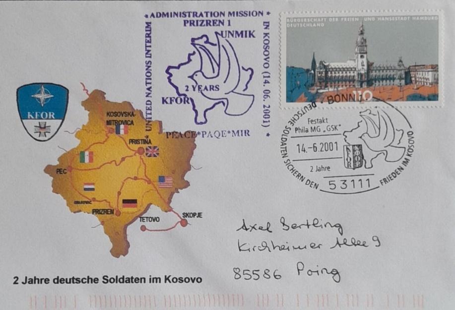 Në këtë kontekst historik merr kuptim zarfi i datës 14 qershor 2001, i përdorur në Bonn të Gjermanisë. Ai shënon dyvjetorin e pranisë së forcave ndërkombëtare në Kosovë dhe pasqyron rolin e Bundeswehr-it brenda KFOR-it. Vula përkujtimore me figurën e pëllumbit të paqes mbi hartën e Kosovës dhe tekstin “Ushtarët gjermanë sigurojnë paqen në Kosovë” përcjell mesazhin e stabilitetit dhe të misionit paqeruajtës.