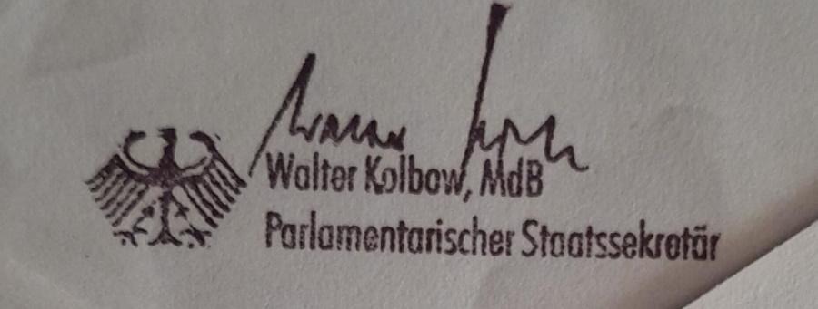 Ne foto, ne pjesen e prapme te zarfit shfaqet nenshkrimi zyrtar i shoqeruar me stemen federale gjermane,dhe nenshkruar nga Walter KolboW, Sekretar Shteti Parlamentar ne Bundestag,ne vitet 1998-2005, (ne Ministrine Federale te Mbrojtjes).