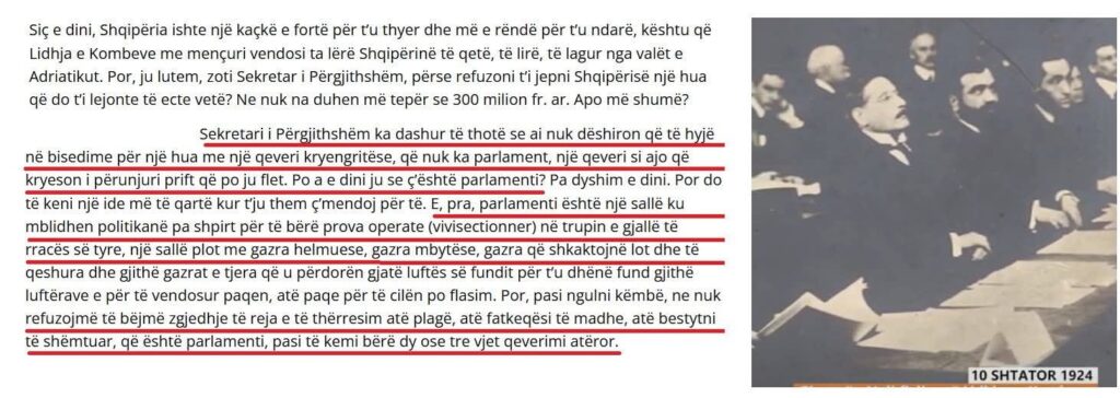 Retrospektivë, 1924. Kryeministri i Shqipërisë Fan Noli mbajti një fjalim në Asamblenë e Lidhjes së Kombeve. Një fjalim që nga njëra anë tregon erudicion, dije, kulturë, karakter dhe kurajë, por nga ana tjetër reflekton mungesë konceptesh mbi demokracinë, legjitimitetin, shtetin dhe politikën. Ishte koha kur Noli u bë kryeministër pa një vendim parlamenti, ky i fundit nuk ekzistonte më, dhe kur fuqitë e kohës kushtëzuan mbështetjen financiare dhe politike ndaj Shqipërisë me zhvillimin e një procesi zgjedhor për rivendosjen e legjitimitetit kushtetues të parlamentit dhe qeverisë. Noli refuzoi. Duke akuzuar të tjerët. Një nga dijetarët më të aftë të botës shqiptare, intelektual dhe atdhetar, megjithatë ditën kur ishte në pushtet mori vendime të gabuara. Me kosto të lartë për veten dhe vendin.