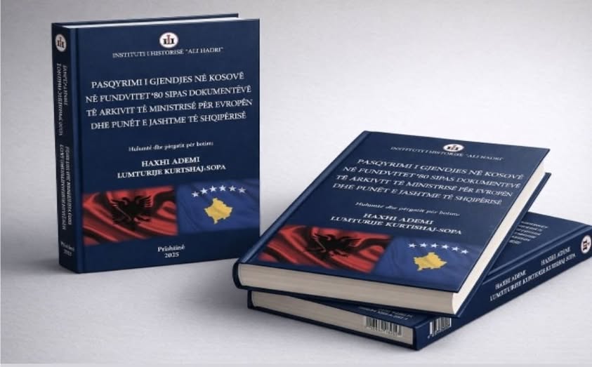 Instituti i Historisë “Ali Hadri” në Prishtinë ka publikuar vëllimin “Pasqyrimi i gjendjes në Kosovë në fund të viteve ’80 sipas dokumenteve të Arkivit të Ministrisë për Evropën dhe Punët e Jashtme të Shqipërisë” përgatitur nga Prof. as. Dr. Haxhi Ademi dhe bashkëpunëtorja e jashtme Dr. Lumturie Kurtishaj-Sopa.