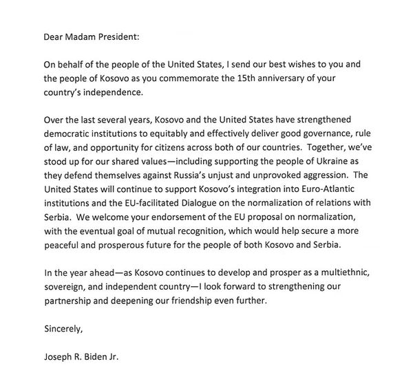 “Në emër të popullit të Shteteve të Bashkuara, ju dërgoj urimet tona më të mira për ju dhe popullin e Kosovës, gjersa shënoni 15 vjetorin e pavarësisë së vendit tuaj. Përgjatë viteve të fundit, Kosova dhe Shtetet e Bashkuara kanë forcuar institucionet demokratike për të ofruar në mënyrë të barabartë efektive qeverisje të mirë, sundim të ligjit dhe mundësi për qytetarët në të dy vendet tona”, ka thënë Presidenti Biden.