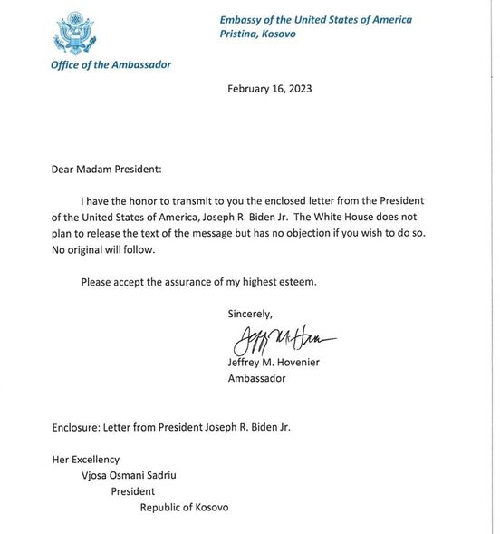 Presidentja e Republikës së Kosovës, Vjosa Osmani, ka pranuar letër urimi nga Presidenti i Shteteve të Bashkuar atë Amerikës, Joe Biden, me rastin e 15 vjetorit të Pavarësisë së Republikës së Kosovës.