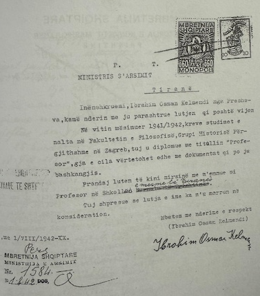 Kësaj atmosfere për sendërtimin e aktivitet arsimor iu bashkangjit e dhe Ibrahim Osman Kelmendi. Nga dokumentet e ruajtura kuptojmë se ky, përmes një lutjeje drejtuar Ministrisë së Arsimit, kërkoi të punësohet si profesor në Normalen “Sami bej Frashëri” në Prishtinë. Ja se çfarë ai shkruan në lutje: “I nënshkruari, Ibrahim Osman Kelmendi nga Presheva, kam nderin me Ju parashtrue lutjen qi poshtë vijon: Në vitin mësimuer 1941/42, kreva studimet e nalta në Fakultetin e Filozofisë, Grupi Historisë përgjithshme në Zagreb, tuj u diplomue me titullin ‘Profesor’, gja e cila vërtetohet edhe me dokumentat që po Ju bashkangjis. Prandaj lutem të kini mirsinë me m’emnue si Profesor në Shkollën Normale të Prishtinës”.