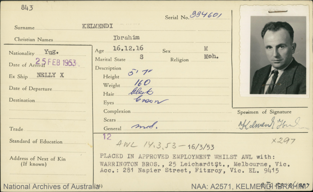 [34] Anija e emigrantëve “MS Nelly” transportoi emigrantët e parë gjermanë sipas skemës dypalëshe të kalimit të asistuar të nënshkruar më 29 gusht 1952. Anija u nis nga Bremeni në fillim të nëntorit dhe mbërriti në Melburn më 5 dhjetor 1952. Ndersa Ibrahim Kelemndi udheton ( si duket) me radhën e dytë po me kete anije, siç shifet nga dokumenti.( Arkivit Kombëtar i Australisë)