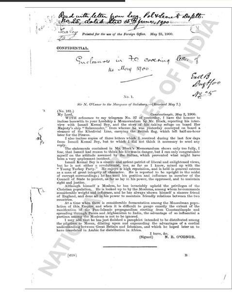 Ngjarjet e përshkruara në këtë fashikull diplomatik zhvillohen para 124 vitesh, konkretisht në fundin e prillit dhe fillimin e majit të vitit 1900. Fashikulli përmban 8 faqe me dokumente dhe shënime të klasifikuara “Konfidenciale”. Ai hapet me letrën që ambasadori britanik në Kostandinopojë Sir Nicholas R. O’ Conor i dërgon kryeministrit dhe njëkohësisht ministrit të Jashtëm britanik Markezit të Salisbury-it (Robert Gascoyne-Cecil, 3rd Marquess of Salisbury, tre herë kryministër i Mbretërisë së Bashkuar në periudhën 1885-1902). Pjesë e dosjes janë edhe dy memorandume, që mbajnë datat 25 janar 1898 dhe 1 maj 1900, të diplomatit britanik Adam Block, i cili shërbente në ambasadën britanike në Kostandinopojë.