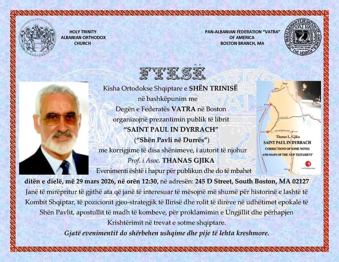 Federata Pan-Shqiptare “VATRA” në Boston, Së bashku me me degën e Worcesterit dhe Kishën Ortodokse Shqiptare të “Shën Trinisë”, ju fton në prezantimin publik të librit “Saint Paul in Dyrrach” (Shën Pavli në Durrës) nga Prof. i Asoc. Thanas Gjika.