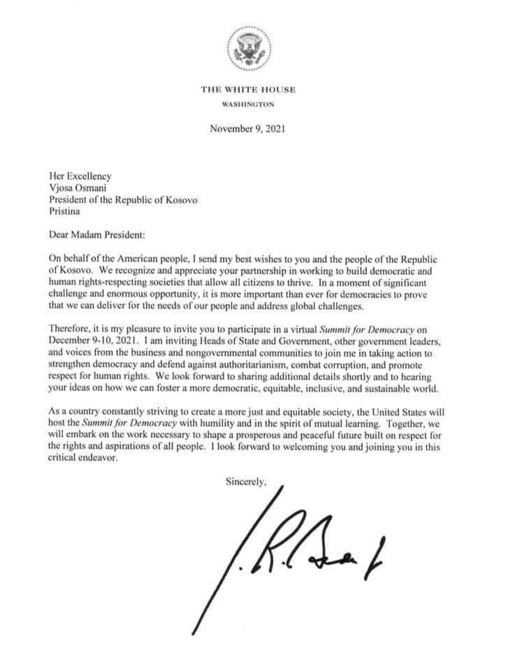 PRISHTINË, 15 Nëntor 2021-Gazeta DIELLI nga korrespondenti në Kosovë Behlul Jashari/ Presidentja e Republikës së Kosovës, Vjosa Osmani ka marrë ftesë zyrtare nga Presidenti i ShBA-ve, Joseph Biden për pjesëmarrje në Samitin për Demokraci, i cili do të mbahet më 9-10 dhjetor.“Falënderoj Presidentin Biden për ftesën në Samitin për Demokraci të organizuar nga Shtëpia e Bardhë si dhe vlerësimin për partneritetin e ofruar nga Kosova për të punuar drejt ndërtimit të shoqërisë demokratike që respekton të drejtat e njeriut, të cilat ia mundësojnë secilit qytetarë ta përmbush potencialin e vet”, ka bërë të ditur Presidentja në deklaratën e dërguar.